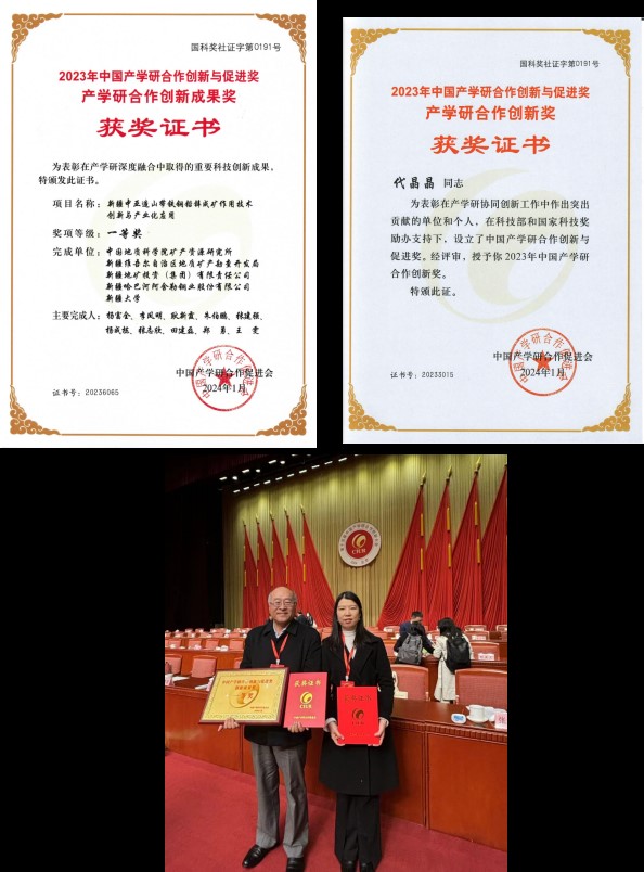 中国产学研合作创新与促进奖是2009年经国家科技部和国家科技奖励办公室批准设立的奖项,是中国面向产学研界协同创新的最高荣誉奖,旨在表彰产学研深度融合的技术创新体系中作出贡献的机构和个人。这两项奖项的获得表明我所在科技创新引领找矿突破中的重要作用。针对新一轮找矿突破,我所将继续发扬自强不息、敢为人先的创新精神,追求卓越、精益求精的工匠精神,以产学研深度融合推动科技创新,以科技创新推动产业创新,为新一轮找矿突破做出更大贡献。