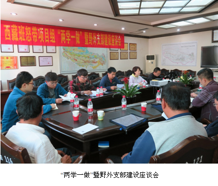 调研组首先在野外项目组临时驻地召开“两学一做”学习教育暨野外支部建设座谈会。会前,受党委委托,党办给野外临时党支部送去了“两学一做”的学习教材,方便大家在野外加强学习。