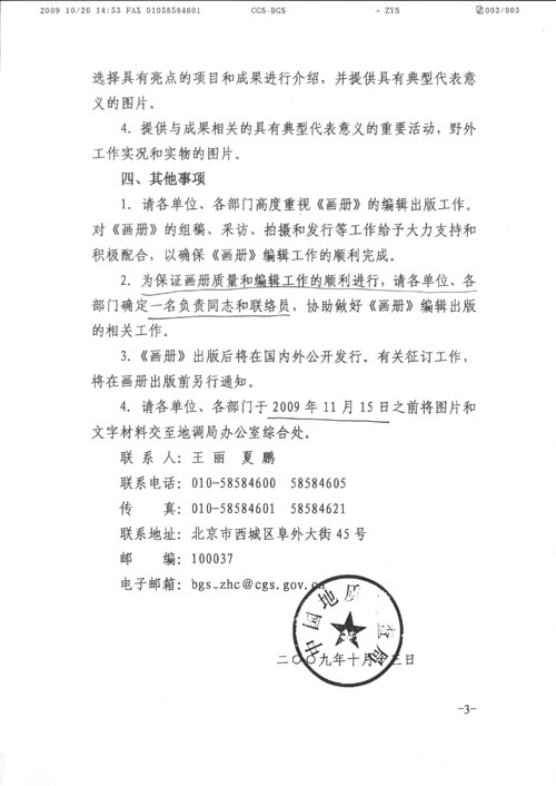 据中国地质调查局“关于组织编辑《地质大调查重大成果》大型画册的函”(中地调函〔2009〕208号)要求,请各项目(特别是获奖项目或结题优秀项 目组)按照通知要求,提供相关照片及其有关内容,交科技处截止时间为2009年11月10日。