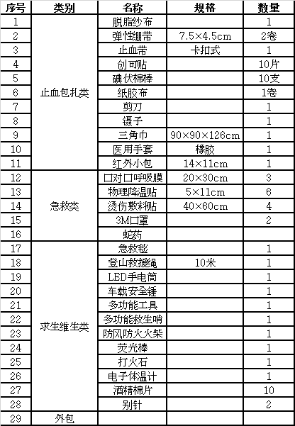 三角巾、止血带、绷带、创可贴、胶布、敷料帖、呼吸面罩、速效救心丸、风油精、云南白药、双频求生哨、荧光棒、防风防水火柴、救援绳、车载安全锤、蛇药、防蚊面罩,氧气袋等