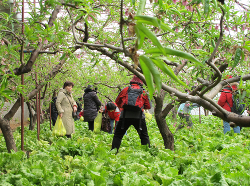 新立村女干部对姐妹们的到来表示热烈欢迎,她介绍了改革开放以来,科技兴农带来的巨大变化,并带领大家到大棚采摘反季节水果和蔬菜。大棚内满眼的绿色与室外的冰天雪地形成了鲜明的对比,大家的热情被这盎然的春意点燃了,饶有兴趣地动起手来。捧着自己采摘的“战利品”大家都露出了开心的笑容。