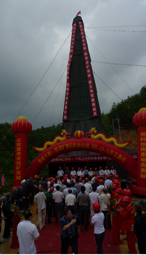 6月25日上午,在国土资源部、中国地质调查局的关心和领导下,南岭科学钻探第一孔(NLSD-1)开钻仪式在江西赣州于都县银坑举行,南岭科学钻探成功开钻。这是国土资源部地质找矿工作在江西革命老区的重要部署,是国家科技专项“深部探测技术与实验研究”专项在南岭重要成矿带组织实施的第一口资源科学钻探井,也是未来超深大陆科学钻探的预导孔。南岭科学钻探第一孔(NLSD-1)的位置选在江西省于都县银坑地区牛形坝矿区,设计钻探深度达到3000米,远远超过以往这个地区的钻探深度,同时这也是我国目前在金属矿区开展的最深的钻探工程之一。南岭科学钻的成功开钻,标志着为揭示于都-赣县多金属矿集区第二找矿空间的深部探测正式启动。