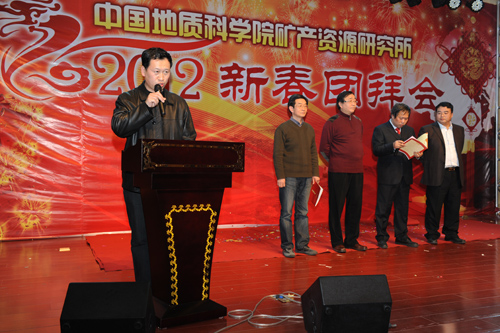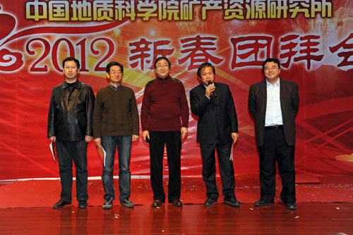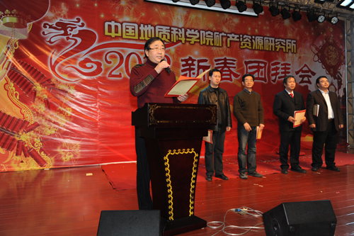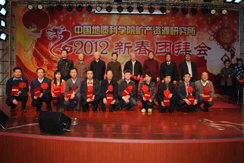 会议由所党委副书记、副所长张佳文主持,所党委书记、所长王瑞江首先作总结讲话和新年致辞;毛景文副所长、王宗起副所长点评了矿产资源研究所2011年度十大科技进展,邢树文副所长宣读了表彰决定。陈毓川、郑绵平、裴荣富、赵文津四位院士应邀出席了总结表彰大会并上台向先进工作者、先进科研团队代表及文明处室代表颁奖。全所200余名职工参加了大会。