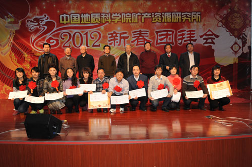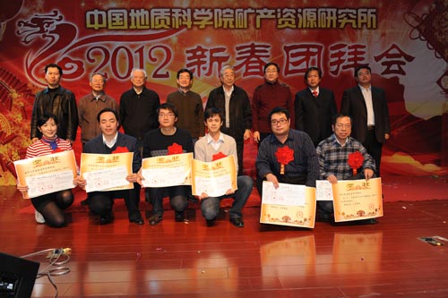 获得矿产资源研究所2011年度十大科技进展的项目是:“新疆拜城县波孜果尔钽铌矿地质普查”,“全国矿产资源利用现状调查”,“长江中下游地区及邻区花岗岩成矿系统”等;所党委对“中蒙边境及邻区矿产地质研究项目组”等6个先进科研团队、刘成林等26位先进个人予以表彰,并分别授予“2011年度先进科研团队”和“2011年度先进个人”荣誉称号;同时授予矿产资源勘查与评价技术方法室等12个处室“2011年度文明处室”荣誉称号;授予郑绵平等6位院士、客座专家“2011年度特别贡献奖”。