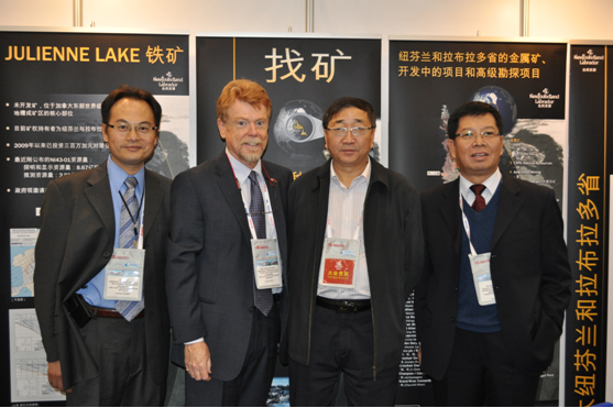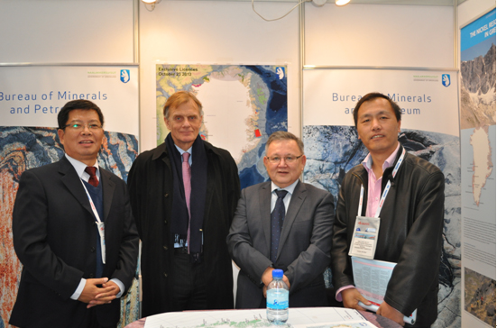 代表团一行参观了机械设备展区,对新式的地质采样工具及运输工具表现出极大的兴趣。裴荣富院士说:“我们应该利用新式地质工具来提高我们的工作效率,保障我们的科学研究”。在加拿大展区,王瑞江所长与纽芬兰和拉布拉多自然资源部矿业总局高技地质师Sean O.Brien(肖恩.奥布伦)、加拿大滑铁卢大学林寿发教授进行了亲切的交谈,详细询问了纽芬兰和拉布拉多省的资源状况。在格陵兰TANBREE公司展台前,王瑞江所长向TANBREE公司的董事长Greg Branes(格雷戈•巴尼斯)先生深入了解了该公司在格陵兰南部稀土矿的情况。聂凤军研究员与赵元艺研究员多次前往格陵兰展区,就中国地质科学家所感兴趣的问题与格陵兰矿产石油管理局(BMP)的参展人员进行交流。格陵兰工业和矿产资源部部长乌•卡尔•贝特尔森(Ove Karl Benthelsen)、丹麦驻华大使裴德盛(Friis Arne Petersen)亲切接见了聂凤军研究员与赵元艺研究员,并表示欢迎中国科学家到格陵兰开展相关科学研究。