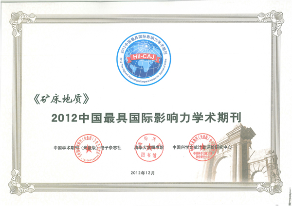 按照各期刊被上述期刊引用的他引总被引频次和他引影响因子的加权(他引总被引频次权重为2,他引影响因子权重为1)综合排序,位列前5%的期刊(科技类共175种)被评为“2012中国最具国际影响力学术期刊”,前5%~10%的期刊被评为“2012中国国际影响力优秀学术期刊”。中国地质学会刊物《矿床地质》、《地质学报》(中、英文版)、《地质论评》和《岩石矿物学杂志》均进入“Top5%”。