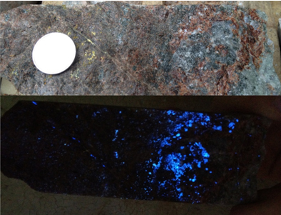 朱溪矿区54线钻孔岩心显示的2个阶段的钨铜矽卡岩