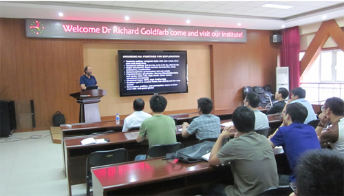 当日下午,Richard博士为我所研究人员和研究生做了题为“变质岩中的金矿床:目前认识与未来研究和勘查方向(Gold Deposits in Metamorphic Rocks: Current Understanding and Future Directions in Research and Exploration)”的学术报告。Goldfarb博士在介绍了全球范围内不同类型金矿床的特征及构造背景之后,着重阐述了变质岩中金矿床集中产出的成矿条件和规律,认为变质岩中金矿床的成矿元素和成矿流体来源与变质作用密切相关,成矿作用受构造控制显著。最后他对变质岩中金矿床今后的研究和勘查方向提出了看法。讲座之后,Goldfarb博士与参加报告会的师生们进行了问答交流,特别是针对中国的金矿床成因展开了热烈的讨论。