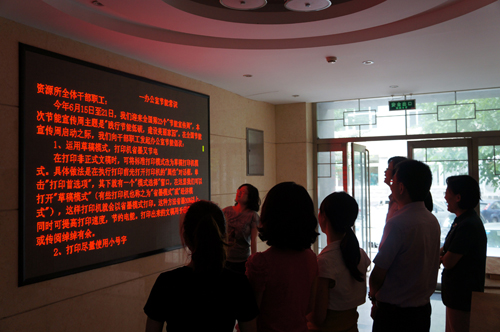 利用楼道显示屏滚动播放办公室节能常识,职工驻足观看
