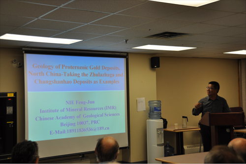 2013年7月22日,应加拿大纽芬兰—拉布拉多省自然资源部的邀请,正在加拿大访问的聂凤军研究员在纽芬兰—拉布拉多省自然资源部地质调查局做了题为《Geology of Proterozoic Gold Deposits,North China:Taking the Zhulazhaga and Changshanhao Deposits as Examples》的学术报告,报告从我国华北金矿成矿地质背景、朱拉扎嘎和常山壕矿床地质特征与成因等角度进行了系统的阐述,提出的“叠合成矿作用”与“三阶段成矿”的理论代表了该类型矿床的最新研究成果。来自纽芬兰—拉布拉多自然资源部地质调查局、该省从事矿业活动的重要矿业公司(Companhia Vale do Rio Doce Vale,Maritime Resources Corp,Marathon Gold,Coastal Gold等)以及纽芬兰纪念大学(Memorial University)的科技和管理人员约60人听取了报告,双方就相关问题进行了深入系统的交流。学术报告会由加拿大纽芬兰—拉布拉多地质调查局肖恩博士(Sean J. O'Brien)主持。