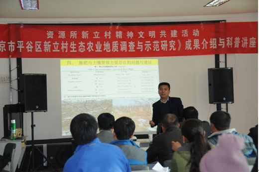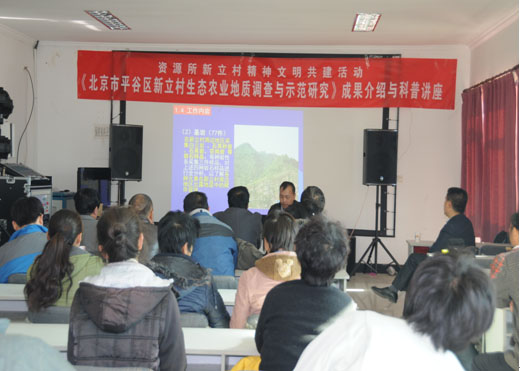 11月25日上午,北风呼啸寒风吹,在京郊平谷区新立村会议室却温暖如春。来自中国地质科学院矿产资源研究所和山东农业大学的有关领导和科研专家,与新立村的50名果农坐在一起,开展了精神文明共建活动面对面授课与交流活动。这是继群众路线教育实践活动要求以来,“落地有音”深入基层、走进农户的实践做法。专家们将资源所和山东农业大学科研人员组成的科研项目组、两年来承担的精神文明共建科技项目《北京市平谷区新立村生态农业地质调查与示范研究》取得的成果以科普的方式进行了介绍与讲座,活动取得了圆满成功,达到了预期效果。