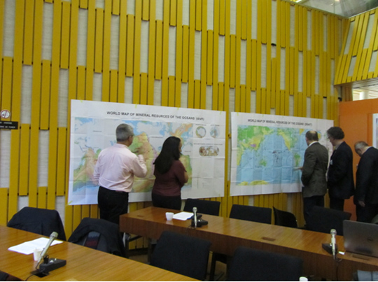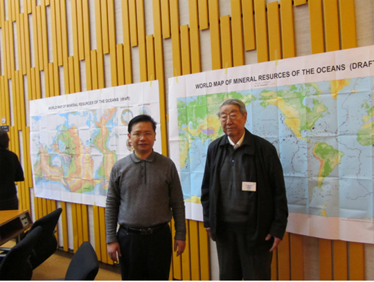 2014年2月19—24日,应世界地质图委员会主席P.罗西的邀请,中国地质科学院矿产资源研究所裴荣富院士、梅燕雄研究员赴法国巴黎,参加在联合国教科文组织总部举行的世界地质图委员会全体会议,汇报承担的国际合作编图项目“1∶2500万世界海洋矿产资源图”工作进展,向外国专家展示了新编的1∶2500万世界海洋矿产资源图(草图)。
