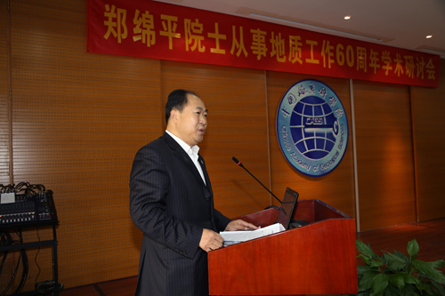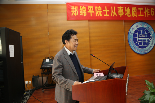 中国地质调查局王研副局长发表了热情洋溢的讲话,他表示:郑绵平院士是我国盐湖科学奠基人和盐湖矿业开拓者之一,是国内外著名的盐湖地质学家。从事盐湖工作60年来,郑绵平院士对青藏高原盐湖和盐类资源勘查评价进行了系统和创新性研究,取得了若干具有国内外先进水平的成果,为我国钾、硼、锂盐类资源的发现、勘查与综合利用做出了卓越的贡献,推动了盐湖环境、盐湖农业和盐科学体系的发展。他号召地质人要学习郑绵平院士身体力行、率先垂范的工作精神,学习他多年来坚持在第一线的大无畏精神;学习郑绵平院士一丝不苟、精益求精的科学精神;学习郑绵平院士求真务实、质疑求知的学术作风。坚持实事求是,大力弘扬理论联系实际、紧扣国家需求,为我国地质事业做出贡献。