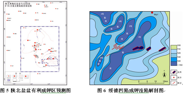 完成陕北盐盆有利成钾层位马五6亚段K+(%)含量等值线图,明确盐盆东南部的绥德凹陷为有利成钾区,将有利成钾区范围锁定在2000平方公里范围内(图5);对位于绥德凹陷内的700余公里二维地震剖面作精细解释,对该凹陷内的次级成钾洼陷进行深度解剖,提出1号盐洼为首选找钾钻探靶区。