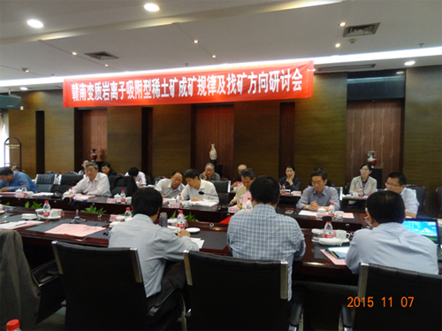 2015年11月7日,中国地质科学院矿产资源研究所在江西赣州组织召开了“赣南变质岩离子吸附型稀土成矿规律及找矿方向研讨会”。会议由地科院副院长王瑞江主持。赣州市委常委、组织部长张圣泽,赣州市委常委、副市长彭业明,赣州市副市长宋全祥,江西省地质矿产勘查开发局副局长余忠珍,赣州市矿管局局长赖亮光、调研员马钊善,江西地质调查研究院院长祝立人、总工程师楼法生,赣县人民政府副县长何凯涛等地方领导,中国地质调查局党组成员、中国地质科学院党委书记王小烈、矿产资源研究所副所长毛景文、王宗起副所长等人应邀出席会议,赣南地质调查大队曾载淋总工程师以及邹天人、杨岳清、王登红、屈文俊、詹秀春等专家和部分项目组成员参加会议。
