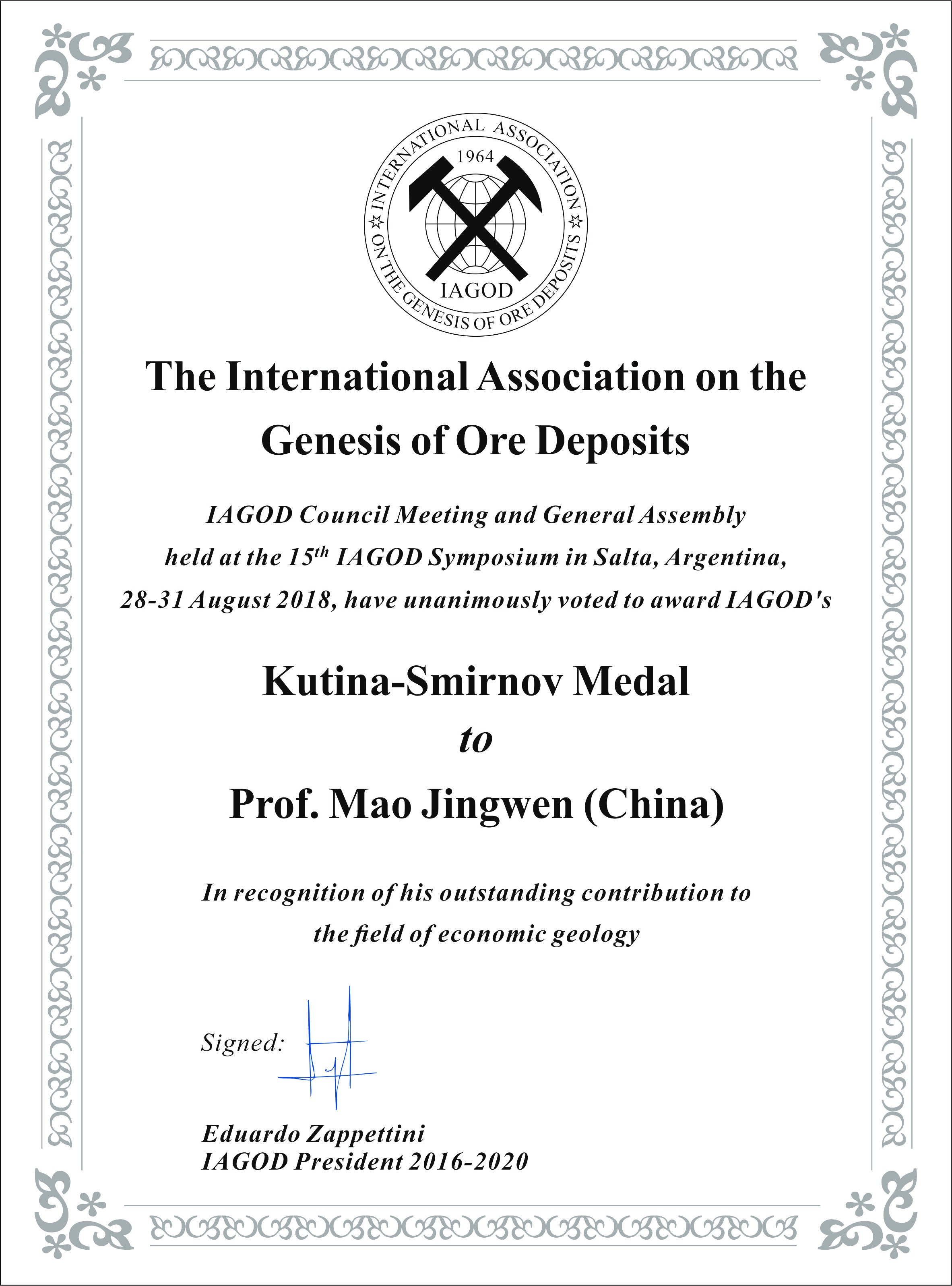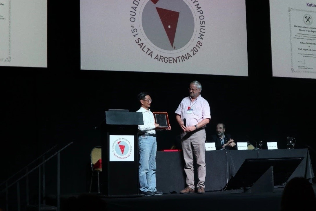 2018年8月31日,在阿根廷萨尔塔举办的第15届国际矿床成因大会上,我所毛景文院士荣获库汀纳-斯米尔诺夫(Kutina-Simirnov)矿床学终身学术成就奖章。毛景文院士成为我国在矿床学领域三大国际组织中获得终身学术成就奖章的首位矿床学家。该奖于2014年创立,主要奖励在经济地质领域做出杰出贡献的科学家。该奖章的获得对于提升我国矿床学国际学术地位具有非常重要的意义。