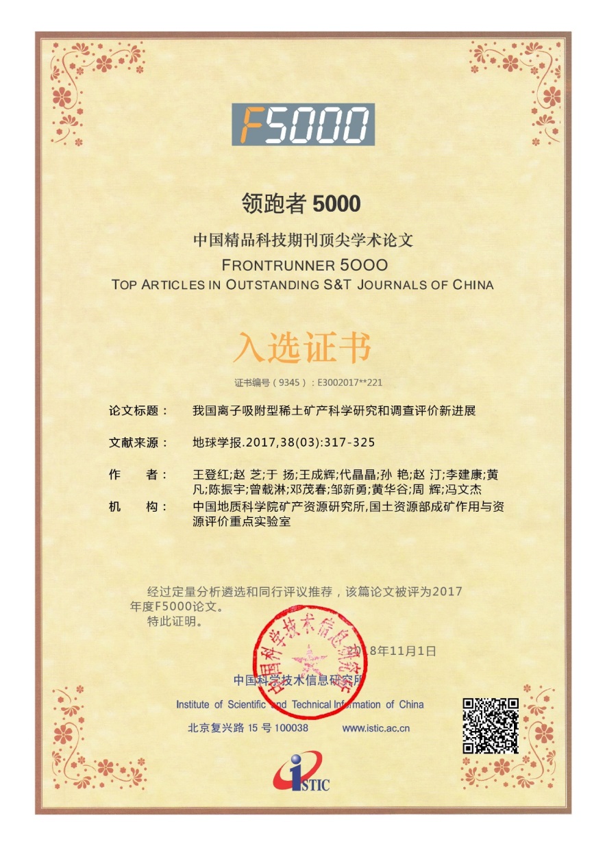 近期,科技部中国科学技术信息研究所发布了2017年度“领跑者5000-中国精品科技期刊顶尖学术论文”获奖名单,自然资源部中国地质调查局所属的中国地质科学院矿产资源研究所王登红研究员发表的论文——《我国离子吸附型稀土矿产科学研究和调查评价新进展》获此殊荣。这是资源所在“战略性关键矿产资源”研究方面又一项获得社会认可的学术成果。该奖项标志着国家当年该学科领域最优秀的科研成果。