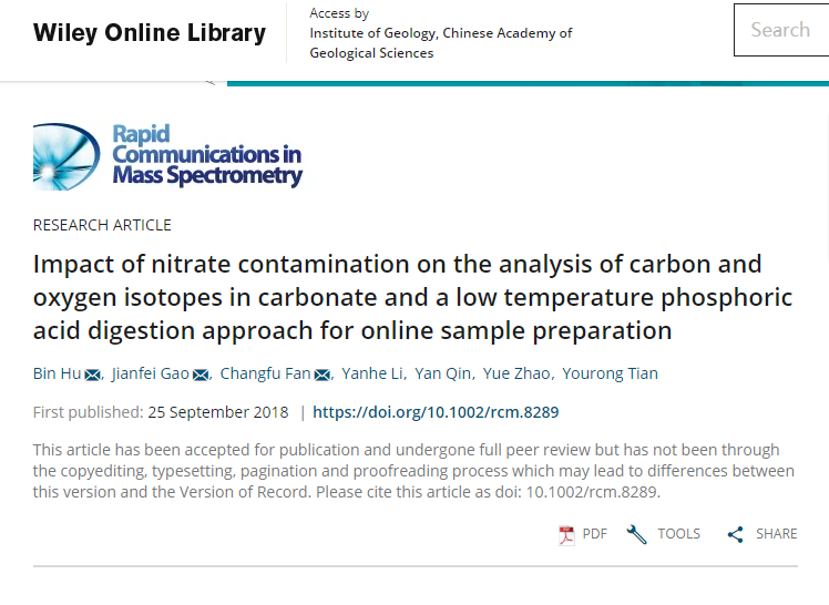 (含硝酸盐碳酸盐碳氧同位素分析方法发表于2018年9月25日的《质谱学快报》上)