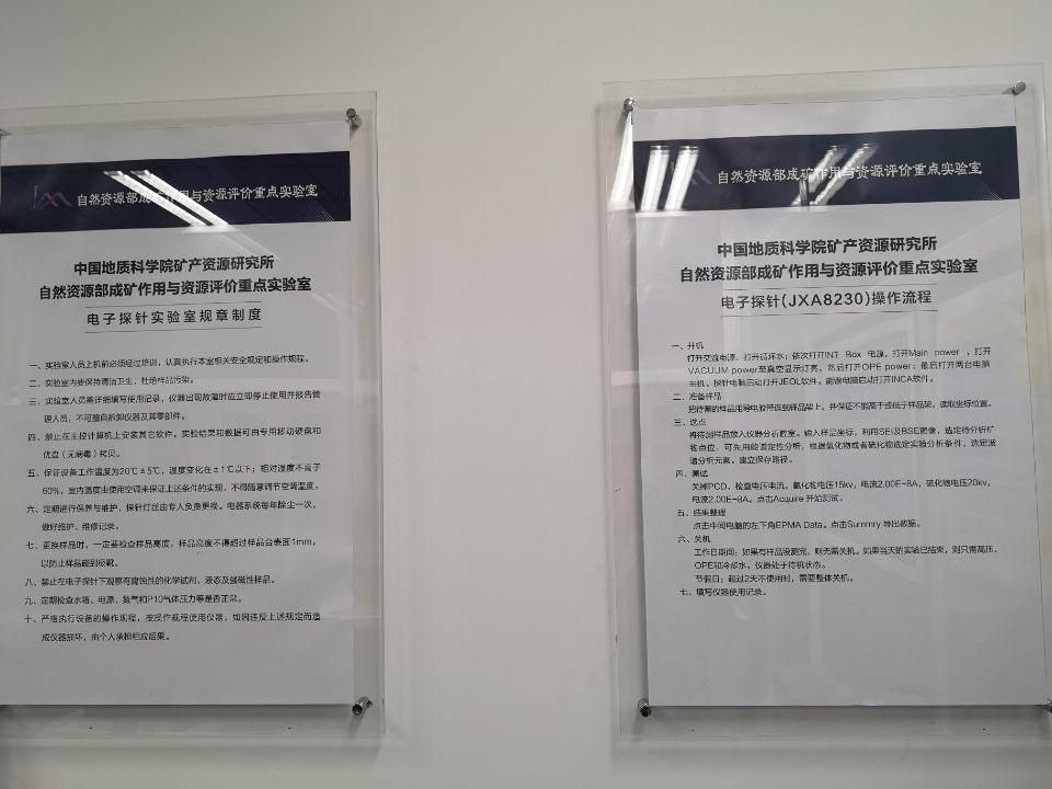实验室安全管理的目的不仅是要营造一个洁净、整齐、具有科学实验氛围的文明、安全的实验环境,而且还要各种安全规章制度上墙,落实安全生产责任制,签订安全生产责任书,使每名实验人员都明确自己的安全职责,加大安全工作执行力度。同时在实验室建立了《电子探针实验室安全管理办法》,对实验室安全操作规程、事故现场处置预案、仪器的使用,包括开机、关机及操作过程中需要注意的问题都做了详细的要求。对各类隐患和违章加大检查、整治、处理的力度。着眼于实验室的全面管理,强调管理、使用、安全一起抓。